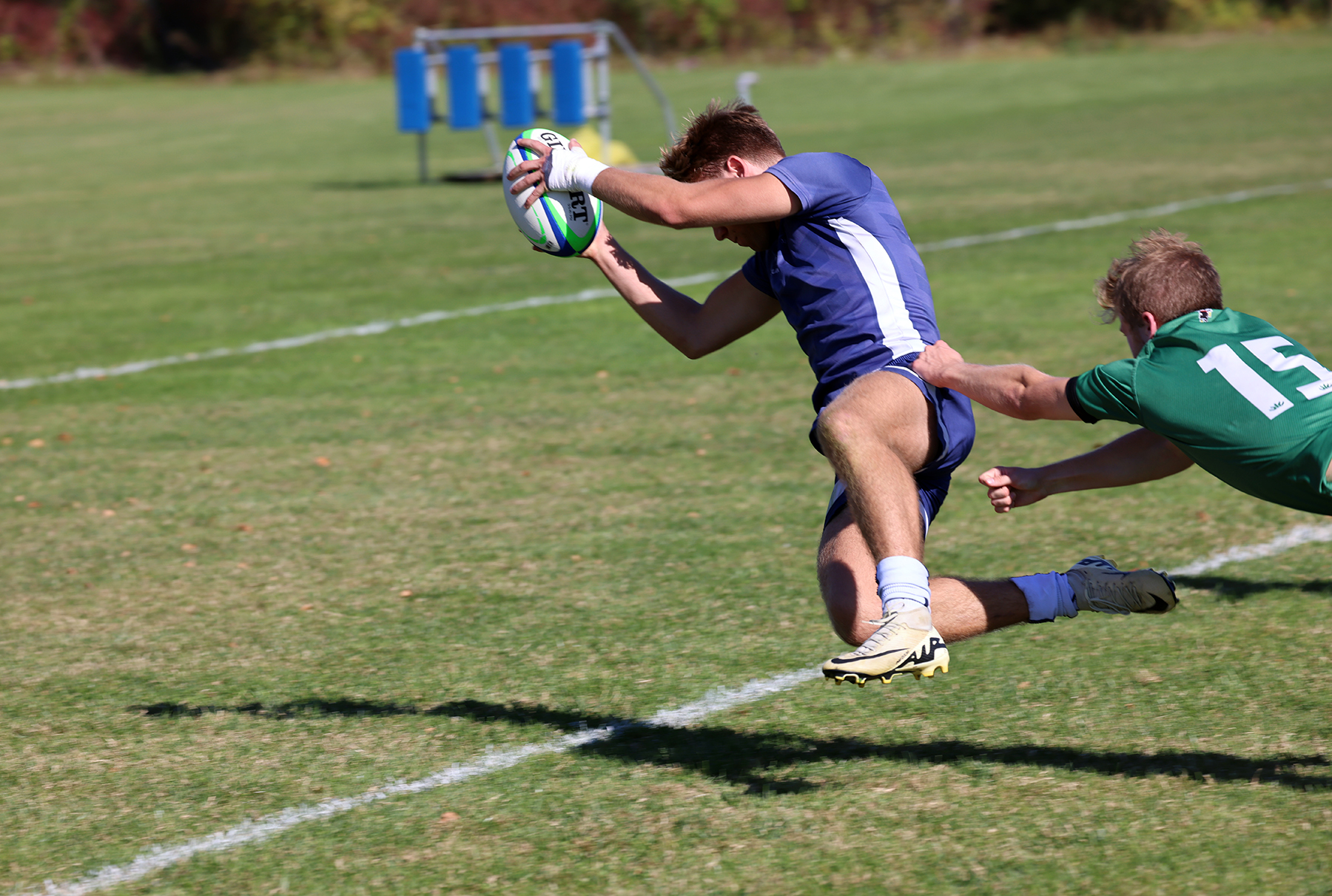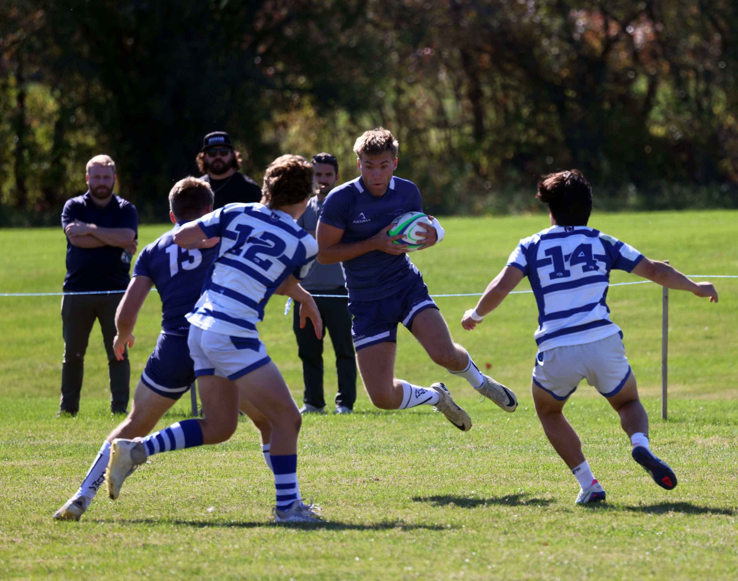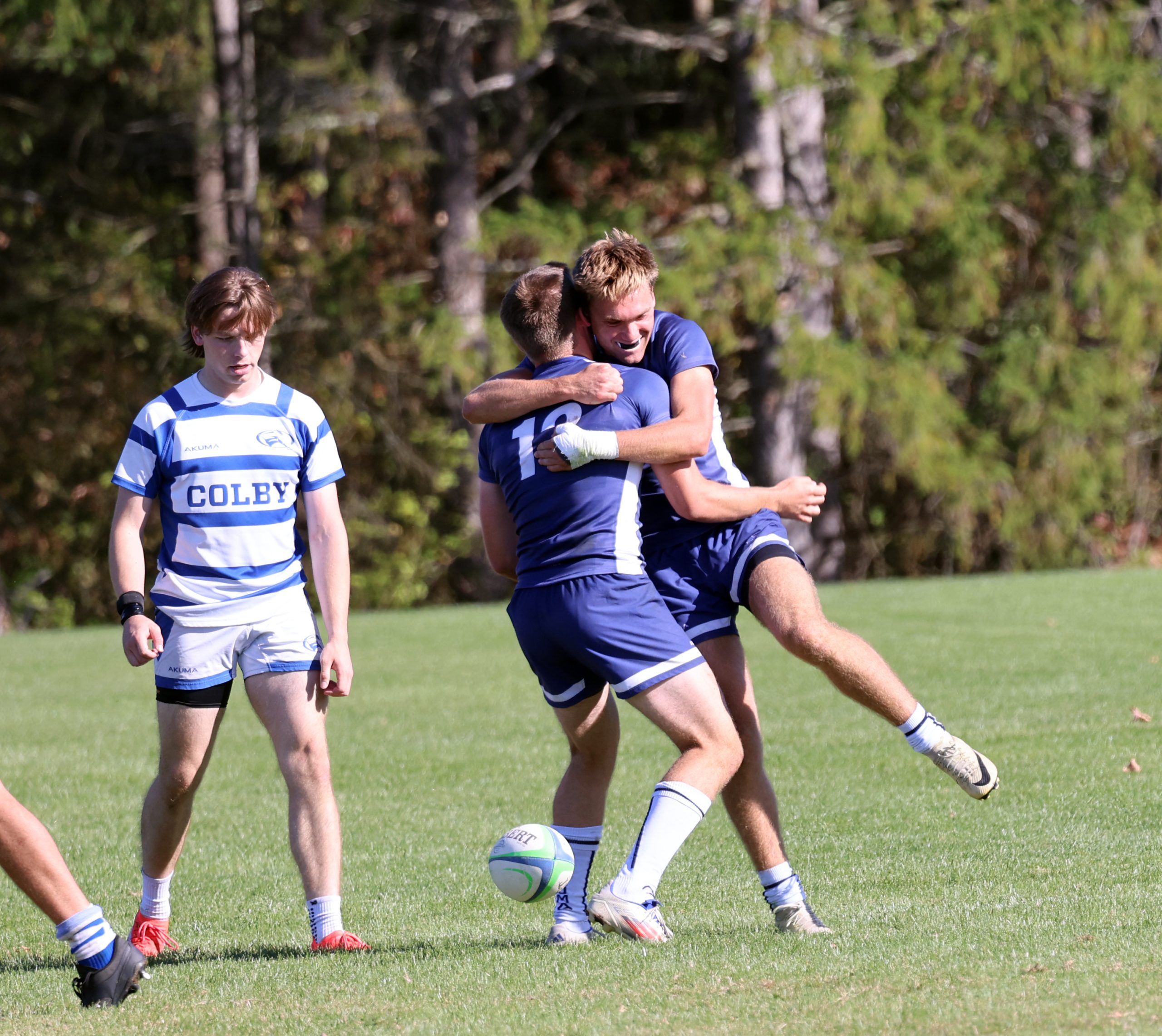 The Panthers walked away with a big win in Game 4 against Colby’s White Mules on Saturday. Middlebury’s Liam Perez scored the first try of the game early in the first period, and though Colby quickly answered back with a try of their own, the Panthers’ Douglas Altshuler made it across the goal line before half time, and Middlebury maintained the lead for the rest of the game. Second half tries were completed by Orion Cherney, Thomas Maloney and Aksel Young, with three conversions by Cai Jane.
